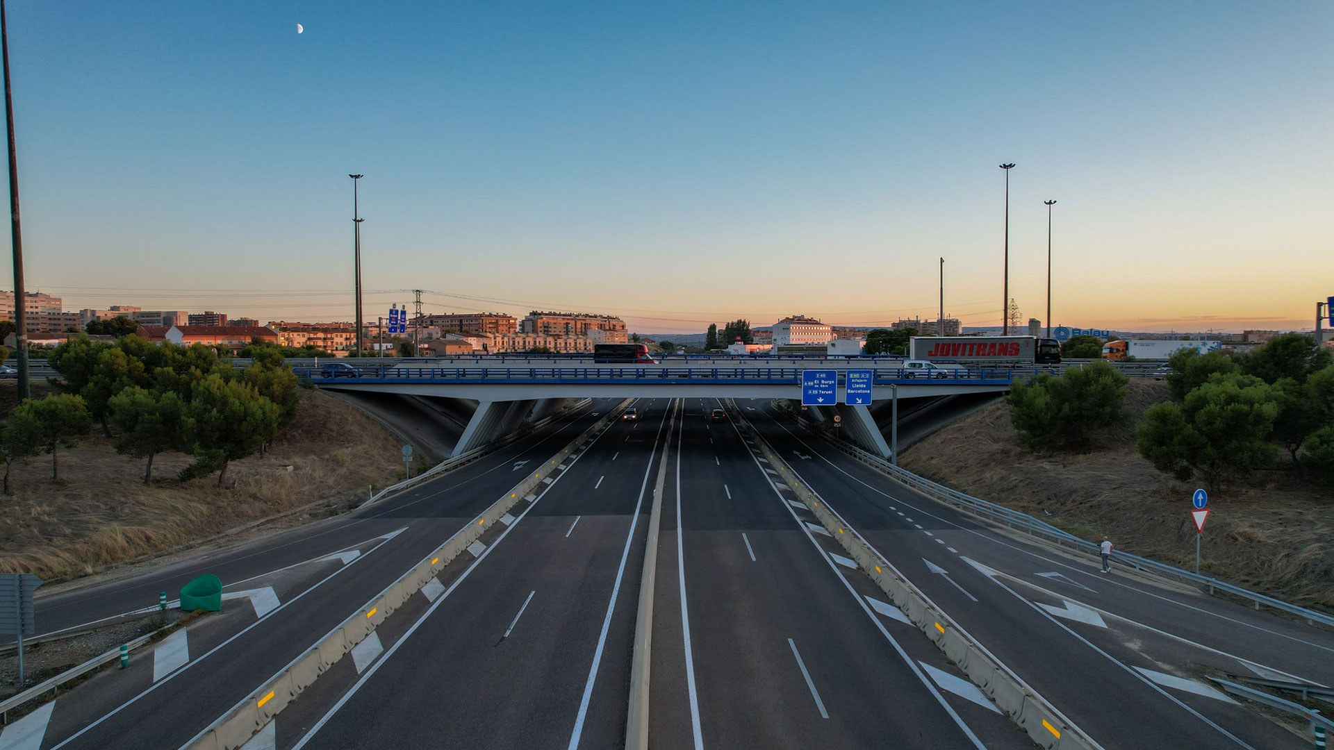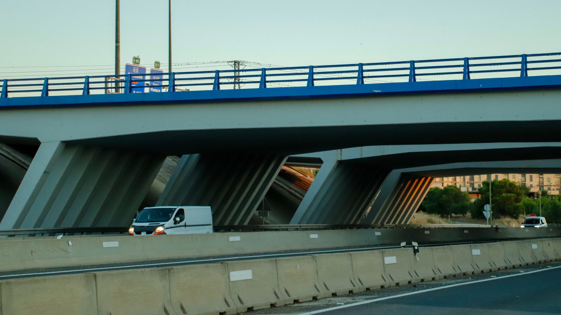 A obra no Viaduto Zaragoza, Santa Isabel, caracteriza-se por uma solução estrutural apoiada em pilares inclinados, permitindo a eficiente distribuição de cargas e a adaptação à geometria do nó rodoviário. A superestrutura assegura a transposição dos eixos viários, garantindo fluidez, segurança e integração na envolvente.