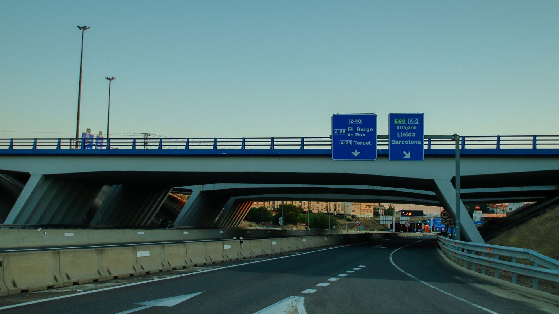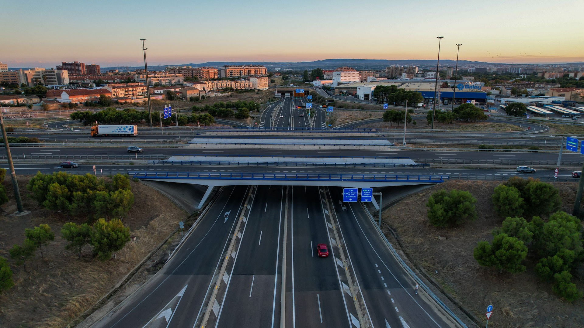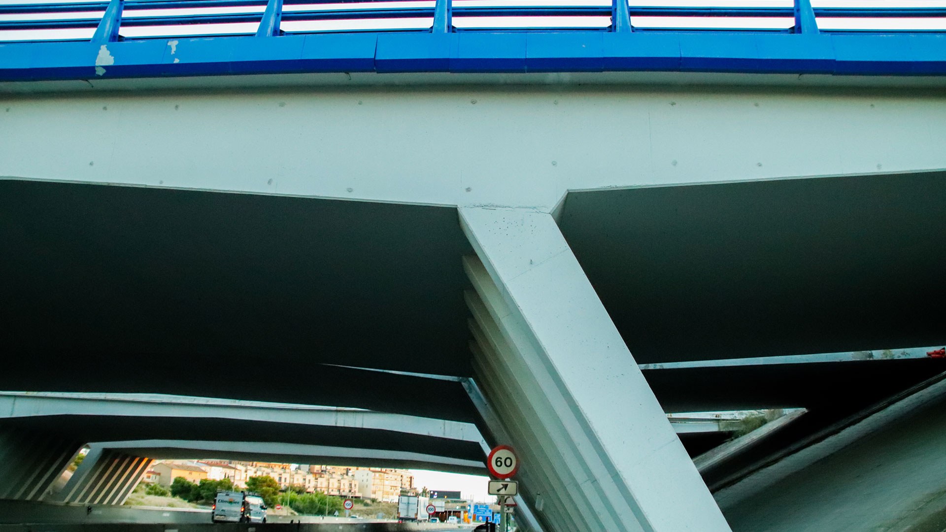 A obra no Viaduto Zaragoza, Santa Isabel, caracteriza-se por uma solução estrutural apoiada em pilares inclinados, permitindo a eficiente distribuição de cargas e a adaptação à geometria do nó rodoviário. A superestrutura assegura a transposição dos eixos viários, garantindo fluidez, segurança e integração na envolvente.